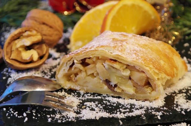 >Постный штрудель не отличить от классического.Вкуснейший яблочный штрудель с орехами, изюмом и пряностями от классического рецепта отличается только одним – его можно есть в пост.Вам понадобятся:>Мука пшеничная — 200 г.<Вода — 150 млМасло оливковое — 1 ст. л.>Соль — 1 ч. л.