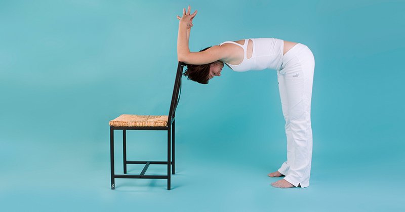 Перед виконанням випий 100-200 мл теплої води. Вибери опору – невисокий стіл або стілець. Обіпрись ліктями на спинку, як показано на зображенні або зігнись, розмістивши долоні на сидінні стільця. Висоту опори вибирай так, щоб тобі було максимально комфортно, а хpeбет був зігнутий. Можеш виконувати вправу спираючись на стіну.